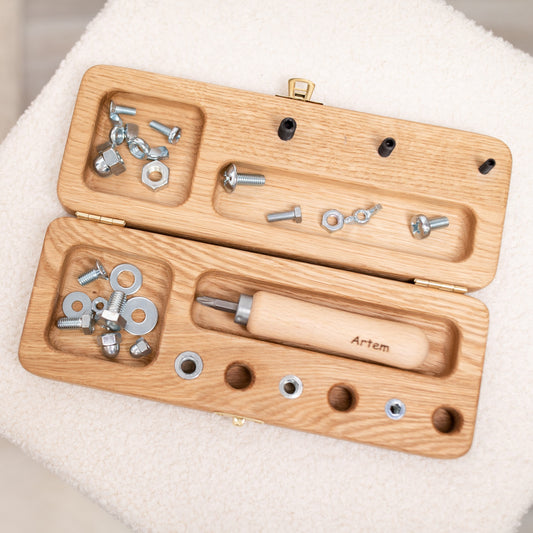 Hands-on Montessori activity set featuring screw boards, tweezers, felt balls, and a labyrinth. Develops fine motor skills, problem-solving, and coordination through engaging, tactile play.