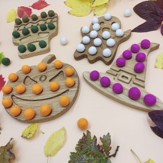 Halloween wooden pumpkin, ghost, witch hat, Frankenstein with felt balls