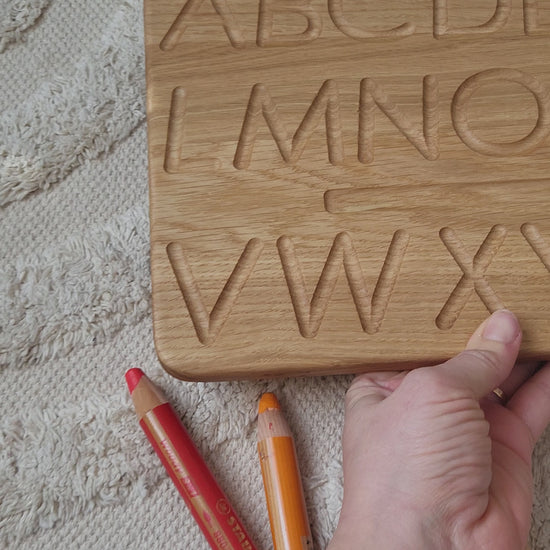 Fördern Sie die Buchstabenerkennung und die Handschrift mit dieser wendbaren deutschen Alphabet-Nachspurtafel. Ein ideales Montessori-Lernwerkzeug für die frühe Kindheit und den Heimunterricht.