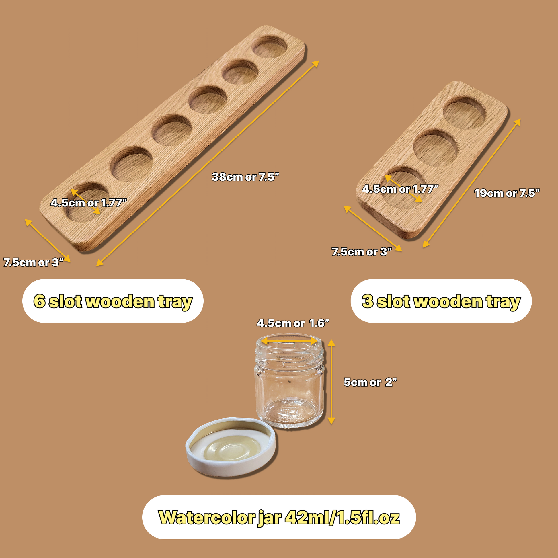 Gerader Farbbehälterhalter aus Holz, geeignet für 3 oder 6 Gläser. Ideal zur Aufbewahrung von Künstlerbedarf in Lernumgebungen, Montessori- und Waldorf-Einrichtungen.