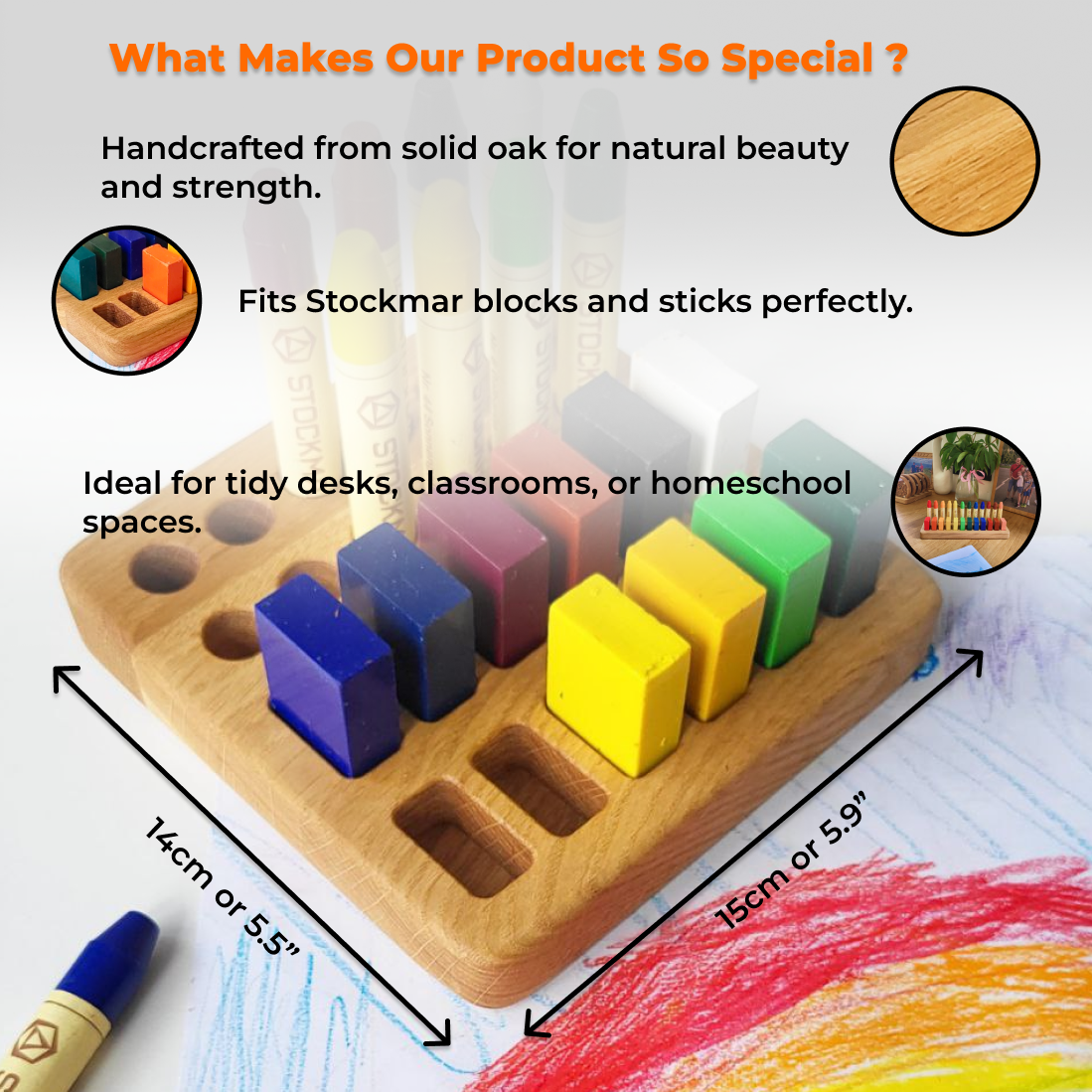 Hölzerner Waldorf-Stifthalter für 12 Stockmar-Blöcke und 12 Stifte. Ideal zur Organisation von Kunstmaterialien in Montessori-Klassenzimmern. Ein praktischer Schreibtischorganizer für kreative Arbeitsbereiche!